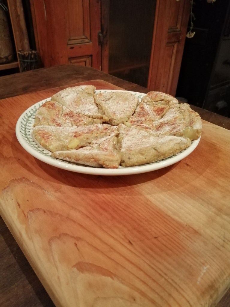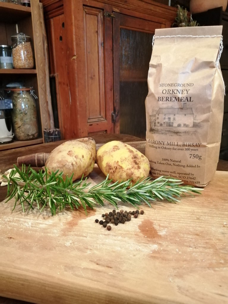 In their most basic form tattie scones consist of only two ingredients: mashed potato and flour. These every day ingredients are mixed to create a dough and cooked on a gridle for a few minutes – simple! While you can use ordinary flour, an authentic recipe would instruct readers to use ‘bere’. This relatively uncommon grain is an ancient form of barley that is still grown and processed on Orkney today. Bere flour can be purchased from Barony Mill in Birsay and is typically mixed with oatmeal when baking. In the case of tattie scones, however, a flour mix is unnecessary.